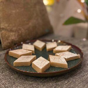 Kaju Katli is an Indian sweet made from cashew nuts and sugar, known for its smooth, melt-in-the-mouth texture. Often shaped into diamond pieces, it’s a symbol of celebration and festivity. Rich and indulgent, it’s a favorite treat for special occasions.